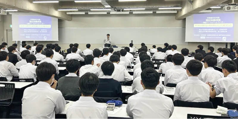 高大連携行事の1つとして、高校1年生の秋に「簿記・会計学ガイダンス(全員対象)」、「簿記体験授業(希望者対象)」を実施しています。また、簿記・会計資格取得を目標とする希望者のため、明治大学経理研究所・資格の大原と連携することで、「簿記3級講座(12月~3月)」、「簿記2級講座(3月~7月)」を開講しています。