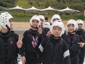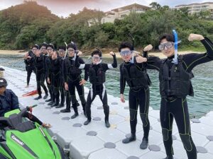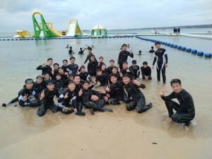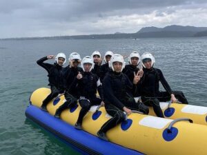 宿舎前のプライベートビーチで、環境学習とマリンアクティビティ(スノーケリング・バナナボート)をしました。