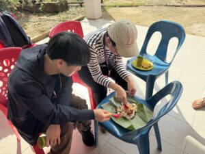 プランテーション見学の前後では、マレーシアの伝統的な朝食であるナシレマやココナッツのお菓子、さらには、サゴムシの幼虫をいただきました。