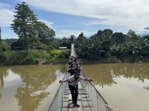 ゴム農園までは、村に設置された吊り橋を渡ります。