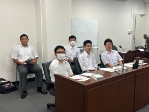 強盗致傷(殺人未遂)事件をモデルケースとして、明治大学法学部の黒澤教授のご指導の下、生徒たち自身が裁判官や検察官の役を演じ、要所要所で裁判の進め方や審議の仕方などの解説をいただきながらの演習となり、非常に有意義な時間を送ることが出来ました。生徒達も実際の裁判に即した演習を受け、大いに刺激を受けていたようでした。